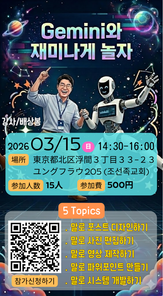 인공지능으로 다양한 문서 작성 사진 편집 및 시스템 개발방식등을 체험하는 오붓한 학습회 입니다. Gemini3의 최근 기능들을 실제적으로 사용하는 실례를 함께 탐구합니다.