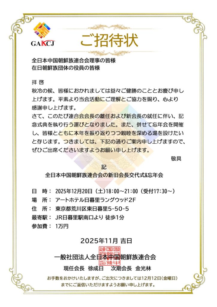 조선족사회의 지속적인 발전에 관심을 가지고 있는 당신에게 보내드리는 전일본중국조선족연합회로부터의 따끈따끈한 초대장입니다.