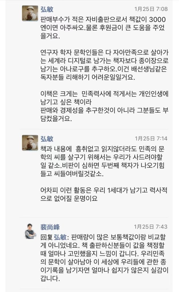 所以不得不佩服三位坚持写作的作家和出版晓系列书籍的日本朝鲜族作家协会,是什么力量让他们在明知不赚钱又很少人会购买阅读的情况下坚持出版这样的书籍的。