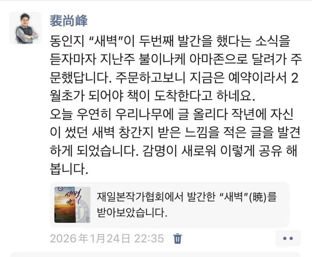 做为参考,也付上2023年晓1的书评,发表在 우리나무 上,这个网站是爱写作的朝鲜族们的净地,也曾因访问量少而面临过倒闭的危机,趁现在网站还在,可以去读一读来自世界各地不同国家朝鲜族们写的生活体验。