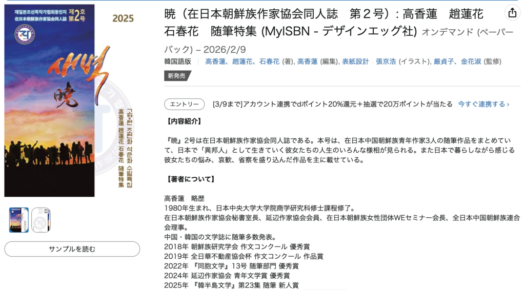 比起2年前“晓1”里出现过很多作者的作品,“晓2”里的作者就相对少一些,集中收录了三位在日本朝鲜族年轻女作家的作品 - 高香莲作家, 赵莲花作家,石春花作家。