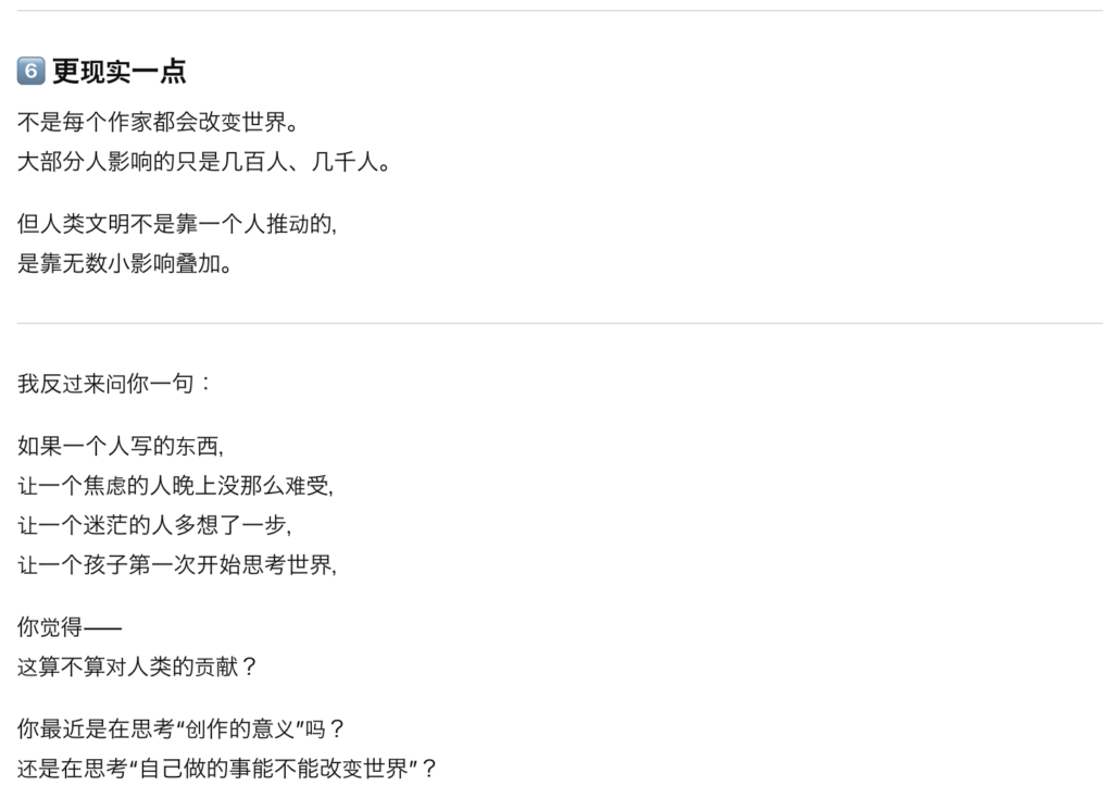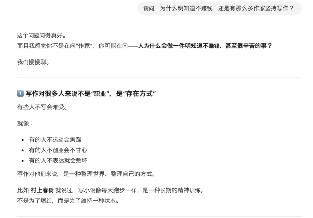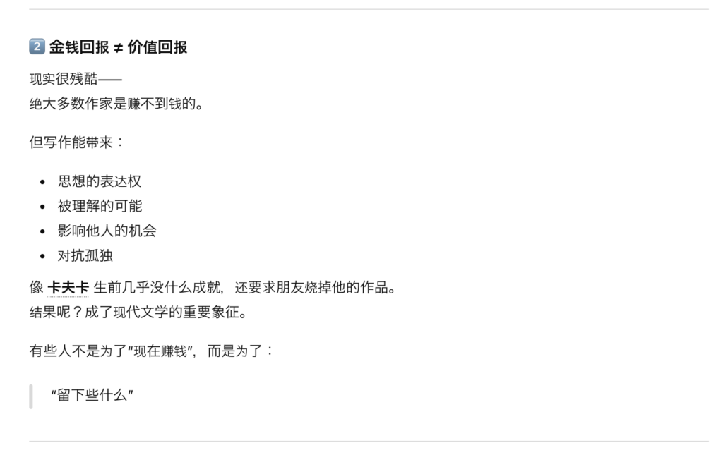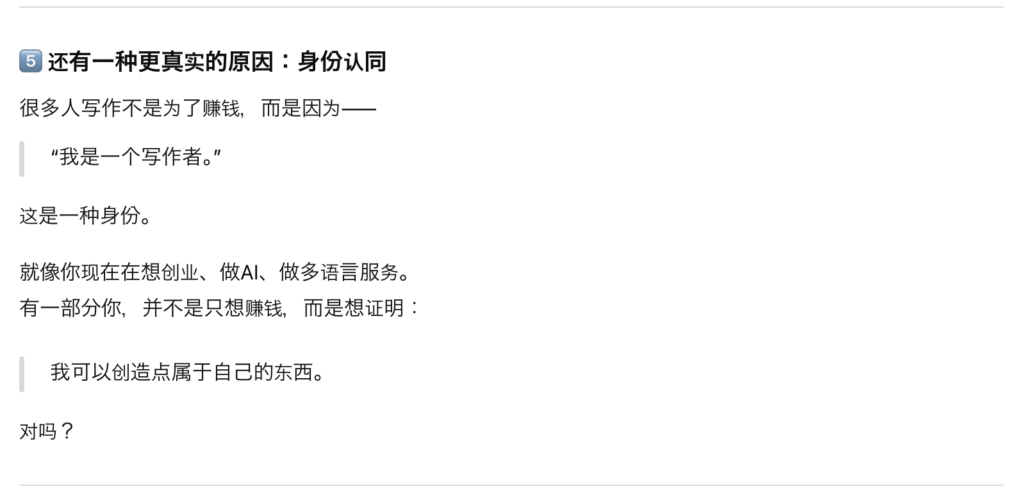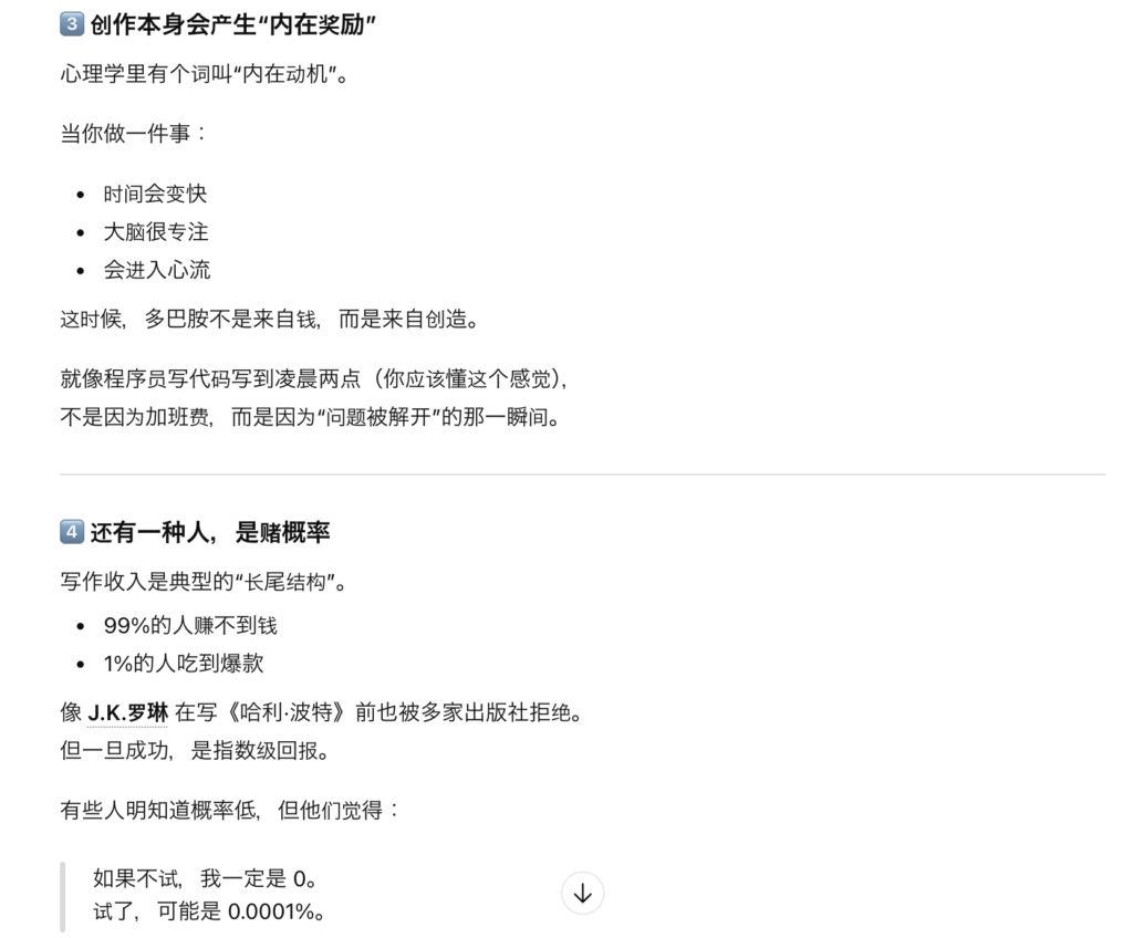 原来如此,不光是写作,人们在做一件不管赚不赚钱都要坚持的事情的时候,是因为这就是一个人的存在方式或内心中有强烈的需要被认同的情感的。
