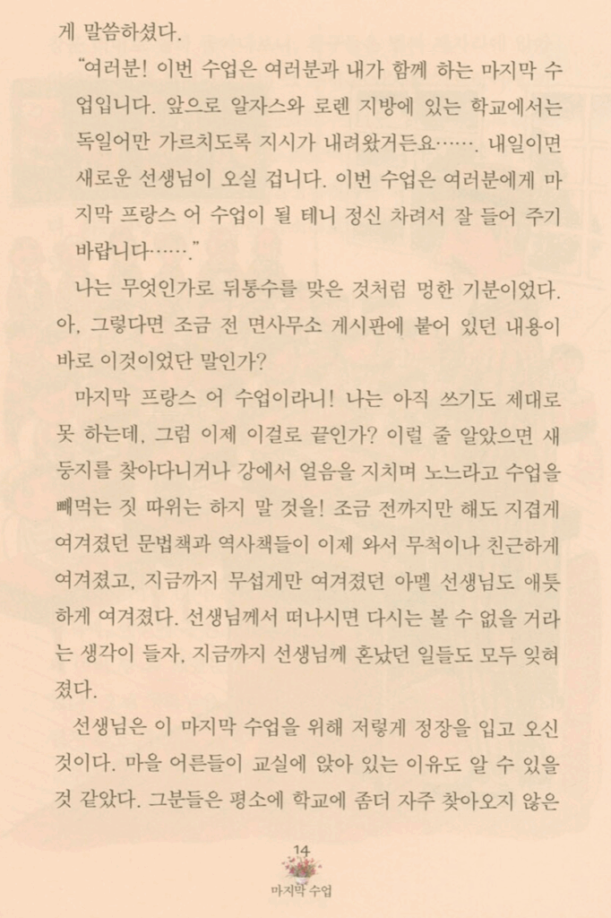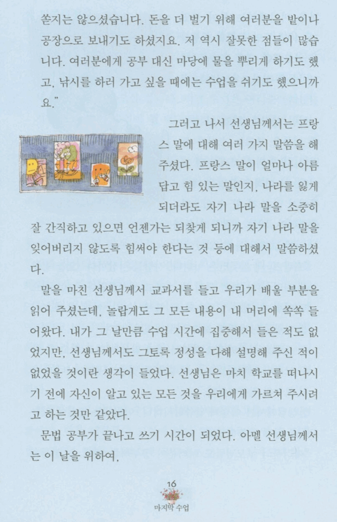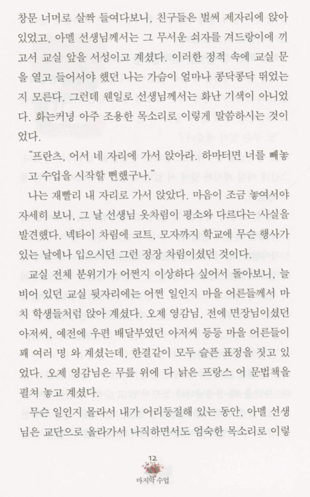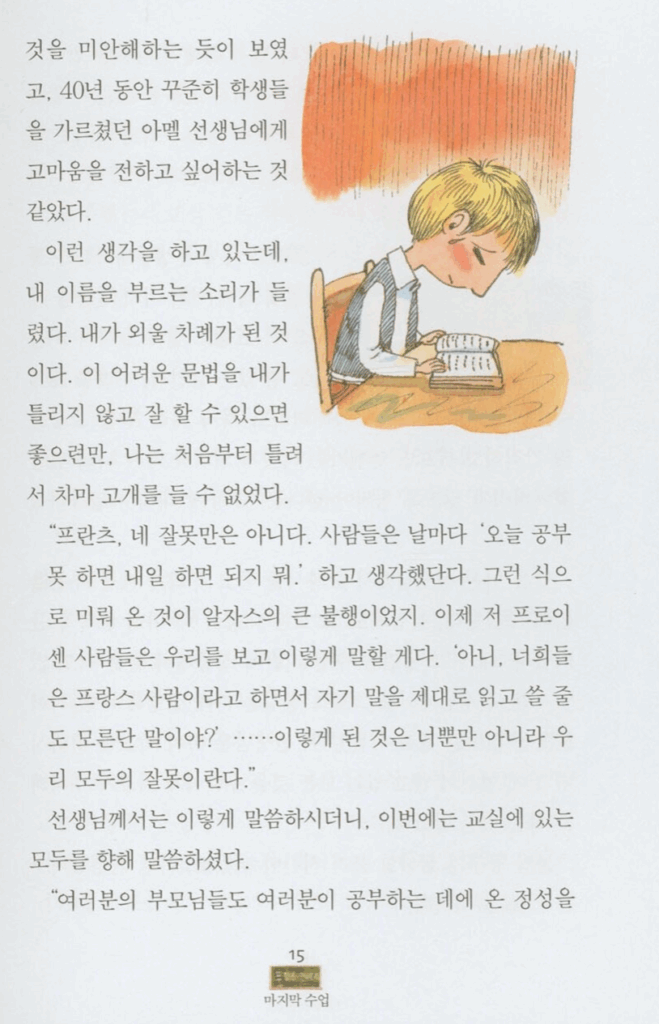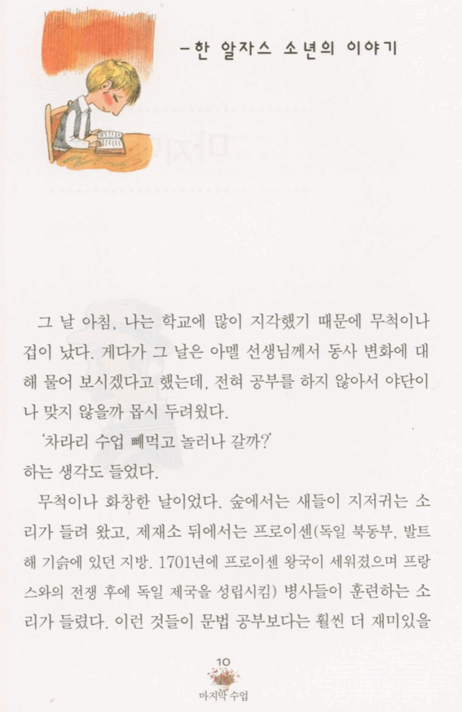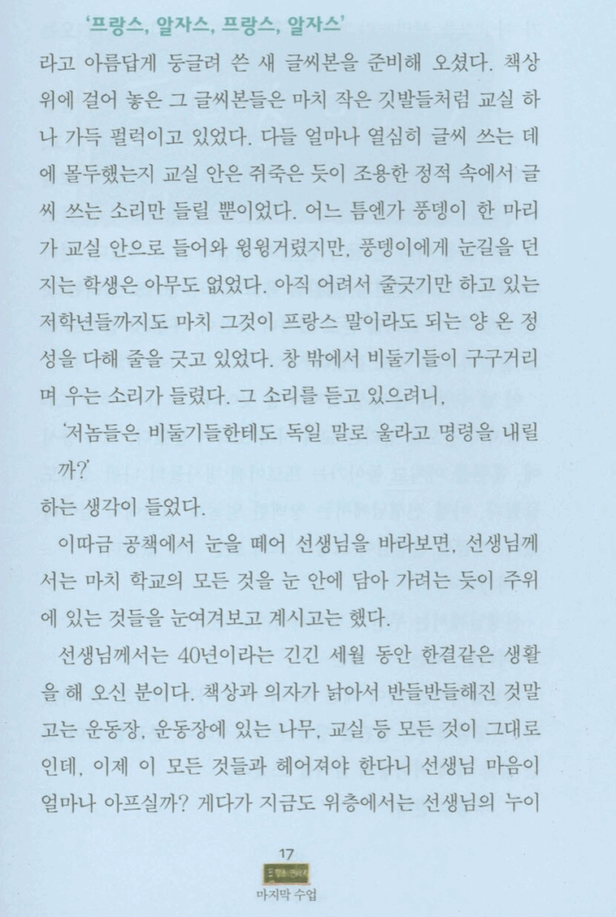중학교 때 배웠던 "마지막 수업"이라는 문장을 다시한번 옮겨보았습니다. 사진출처: https://www.yes24.com/product/goods/104843625 미리보기에서 복사한 것입니다.