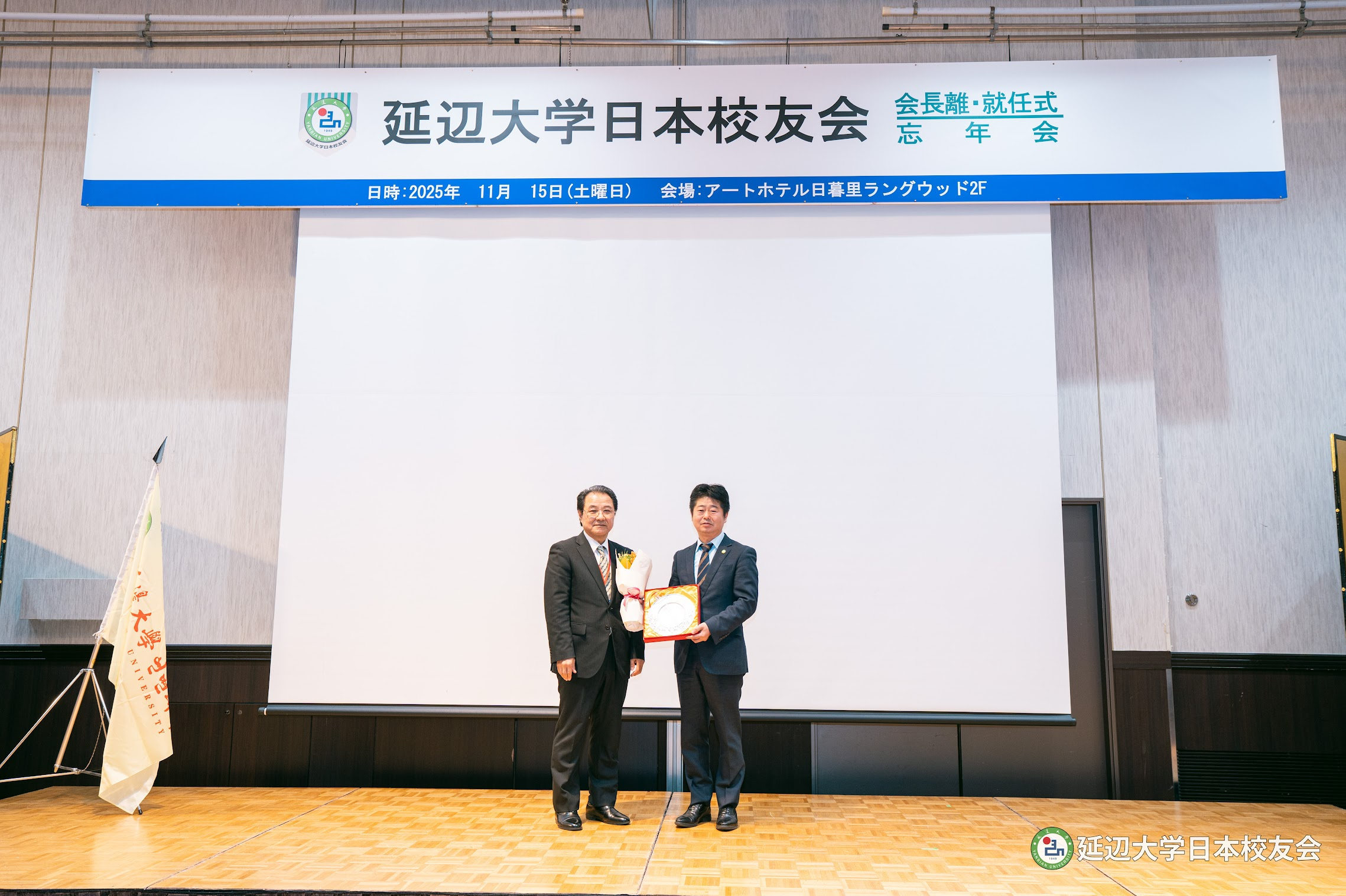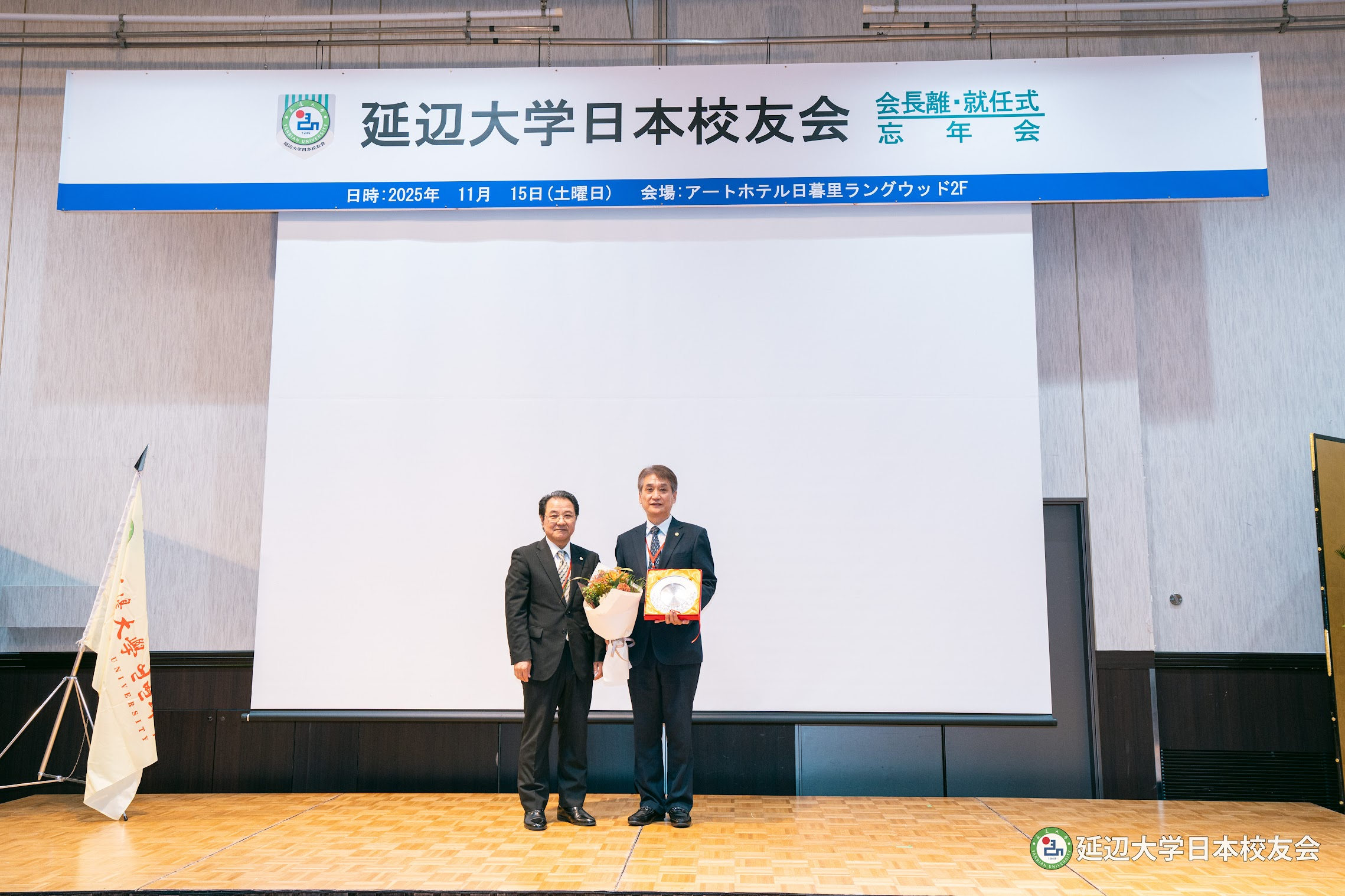 류림 회장과 리성 비서장의 공로를 인정해 연변대학교육기금회·학우총회로부터 수여한 감사패를, 리장춘 신임 회장과 조창환 신임 비서장에게 연변대학학우회총회로부터 수여한 임명장을 연변대학일본학우회 장경호 명예회장이 전달했다. 이어 진행된 연변대학일본학우회 깃발 인계식은 학우회의 새로운 출발을 상징적으로 보여주는 순간이었다.