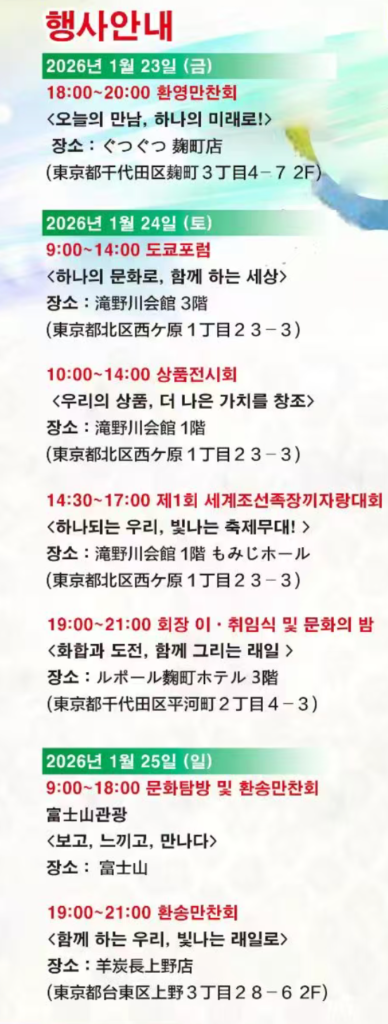 당일 저녁에는 또한 주최단체인 일본조선족경제문화교류협회의 회장이취임식도 진행될 예정이므로 (주의! 다른 장소입니다. 이동하는데 1시간정도의 여유를 두는것이 좋습니다) 참가하시는 분들은 사전에 이동방식도 확인할 필요가 있습니다.