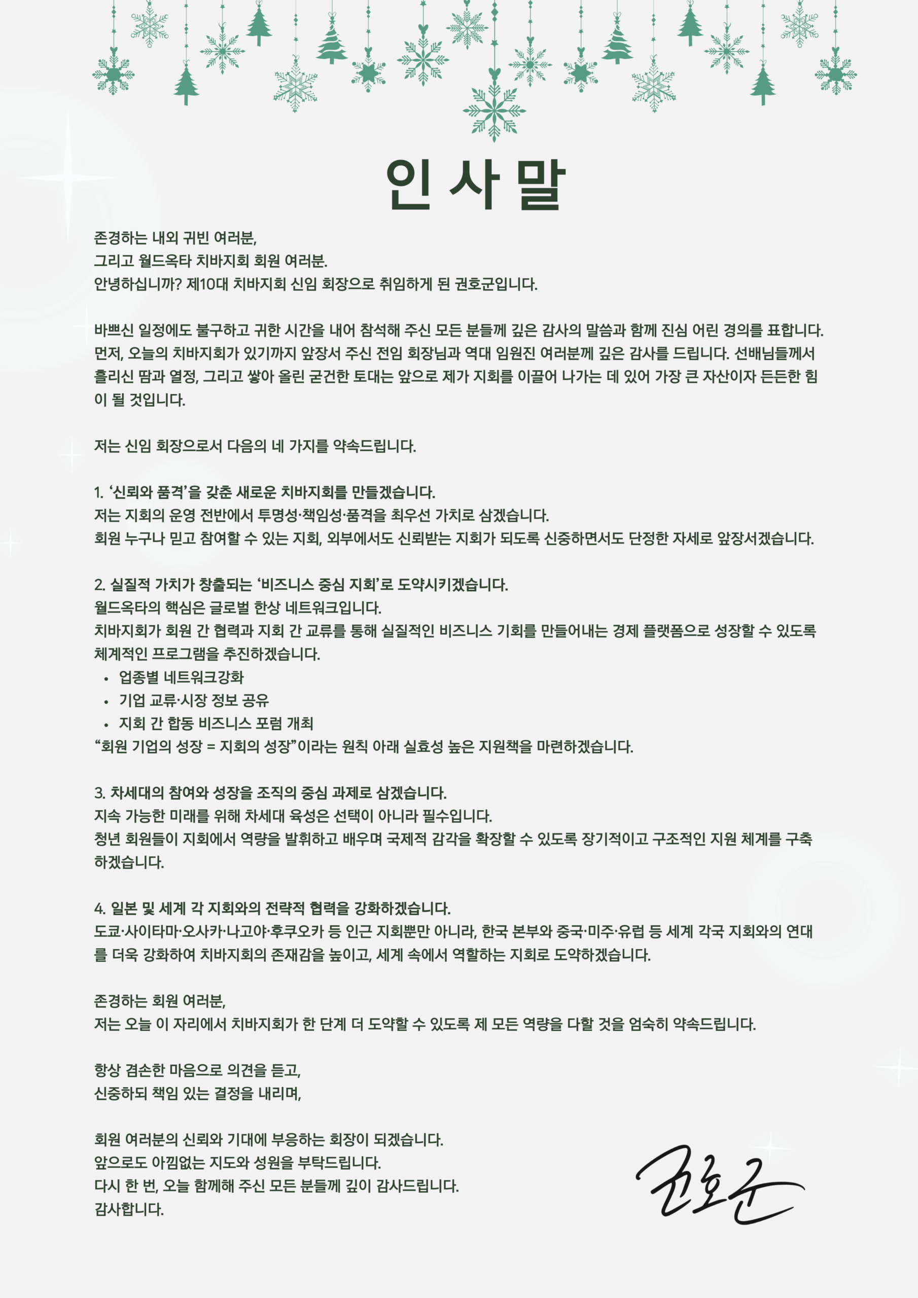 이취임식에서는 서성일 제9대 지회장이 임기를 공식적으로 마무리하고, 권호군 제10대 지회장이 새롭게 취임했다. 권호군 신임회장은 전임 회장단의 노고에 감사를 표하며, 향후 지회 운영 방향으로 △투명성 기반의 신뢰 운영 △비즈니스 중심 활동의 강화 △차세대 육성의 체계적 확대 △국내·외 지회와의 전략적 연계 강화 등 네 가지 비전을 제시했다. 그의 발표는 참석자들로부터 높은 기대와 공감을 이끌어냈다.