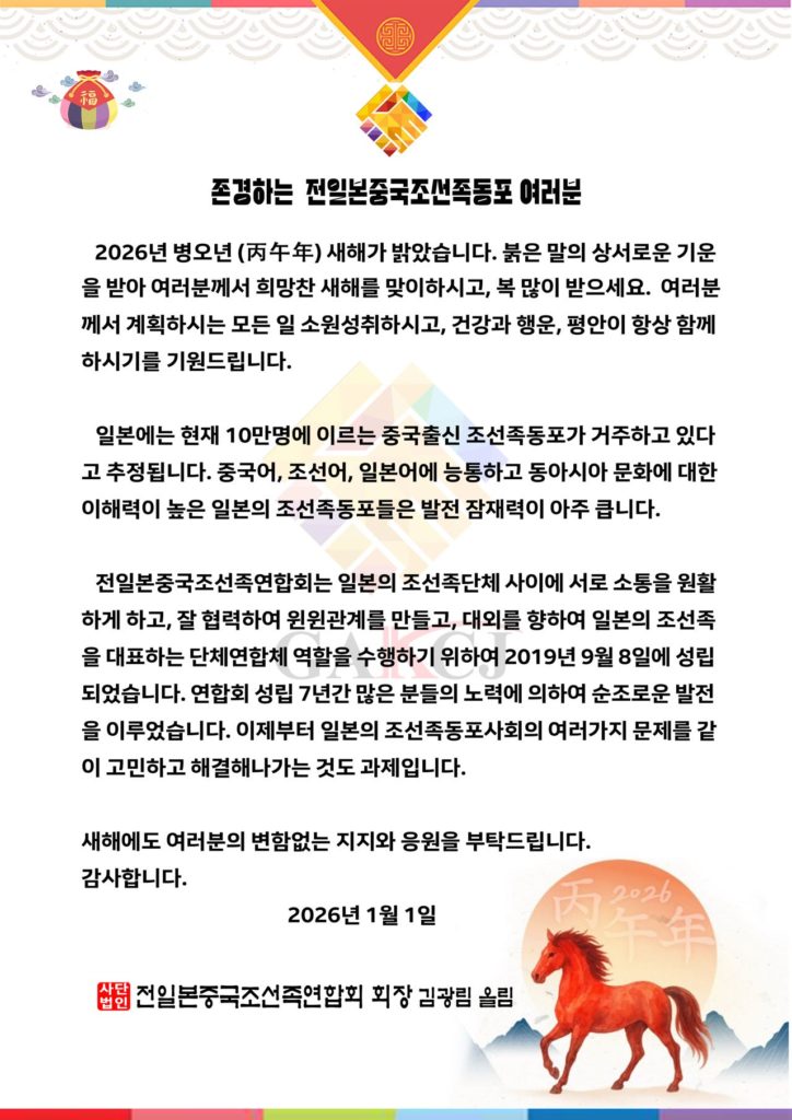 사단법인 전일본중국조선족연합회 회장 김광림 올림