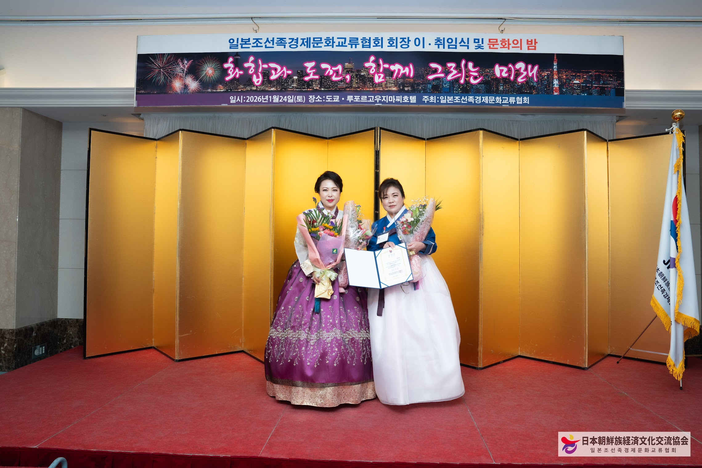 이날 행사에서는 高尾蓮子(김련) 신임 회장에게 임명장과 회기가 전달되며 공식 취임이 이뤄졌다.